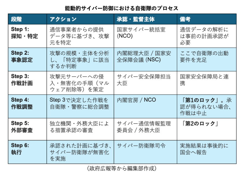 ACD発動のトリガーとなる「特定事象」は、外国政府機関やそれに準ずる組織(State-sponsored actors)による高度かつ組織的な攻撃が、行政機関、重要インフラ、あるいは自衛隊や在日米軍のシステムを標的とした場合に認定される。この認定は、内閣総理大臣が国家安全保障会議(NSC)の審議を経て行う。