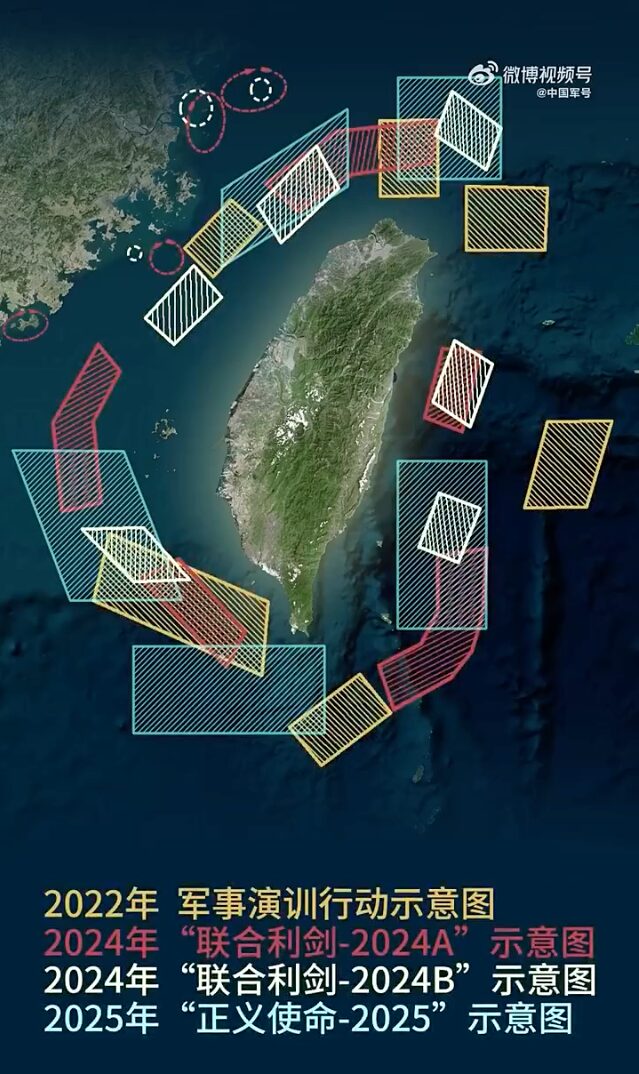 中国は2022年8月、米民主党の最中国強硬派であるナンシー・ペロシ氏が下院議長として25年ぶりに訪台したことに反発して、台湾を包囲する6つの区域を設定した重要軍事演習を初めて行った。その後、2023年4月に連合利剣、2024年5月に連合利剣−2024A、10月に連合利剣−2024B、2025年4月に海峡雷霆−2025Aと、台湾包囲演習を立て続けに実施している。