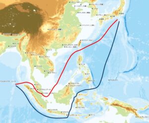 赤線は通常ルート、青線は台湾周辺海域を迂回するルート