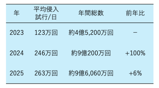報告書によると、2025年における中国サイバー部隊の台湾重要インフラへの侵入試行は、1日平均263万回、年間総数は約9億6,000万回に達した。2023年の1日平均123万回(年間約4億5,200万回)、2024年の246万回(年間約9億200万回)と比較すると、わずか2年で113%増という急激な増加を示している。