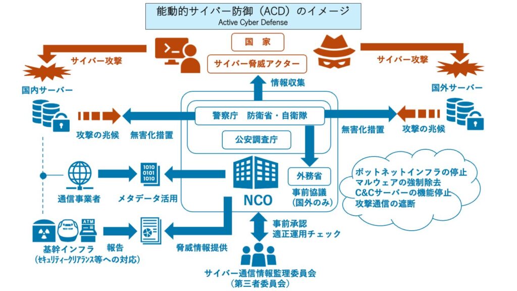 今回の戦略の最大の焦点は「能動的サイバー防御(ACD)」だ。攻撃を受けてから対処するのではなく、攻撃の予兆を検知した段階で相手のサーバーに侵入し、無害化措置を行う。12月23日の決定により、3つの権限行使が政策として確定した。