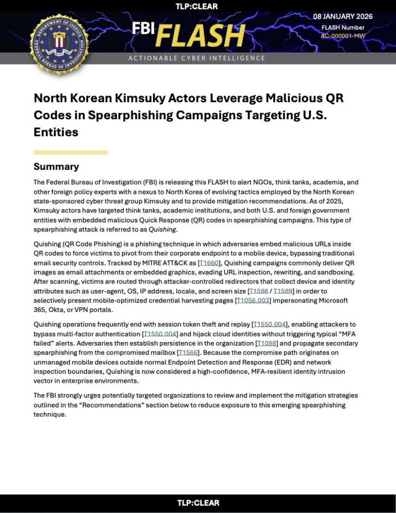 カシ・パテルFBI長官は昨年12月16日、ポッドキャストで衝撃的な数字を明かした。「2025年の北朝鮮やロシア、中国といった敵対国家のスパイの逮捕者数は、前年比35%増加した」。この発言から3週間後の2026年1月8日、FBIは新たな脅威を警告する公式文書を発表した。北朝鮮系のハッカー集団「Kimsuky」が、QRコードを悪用した新型フィッシング手法で米国のシンクタンク、大学、政府関係者を標的にしているという。この手法は「クイッシング(Quishing)」と呼ばれている。