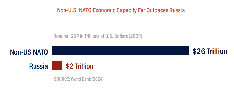 非米国NATO諸国の経済力はロシアをはるかに上回る 名目GDP(兆米ドル、2024年) 非米国NATO:26兆ドル ロシア:2兆ドル 出典:世界銀行(2024年)