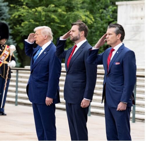 トランプ大統領、JDヴァンス副大統領、ピート・ヘグセス国防長官が、バージニア州アーリントンのアーリントン国立墓地にある無名戦士の墓での戦没将兵追悼記念日献花式で敬礼する。