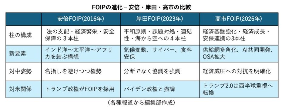 FOIPは2016年8月、安倍首相(当時)がアフリカ開発会議(TICAD VI)で提唱した。太平洋からインド洋、アフリカに至る広域を「法の支配」と「航行の自由」で結び、中国の「一帯一路」に対する代替秩序を示す構想を指す。米国のトランプ第1期・バイデン両政権にも採用され、日本発の外交コンセプトとして異例の浸透を果たした。2023年には岸田文雄首相(当時)が気候変動や食料安保を加えた4本柱に再編している。