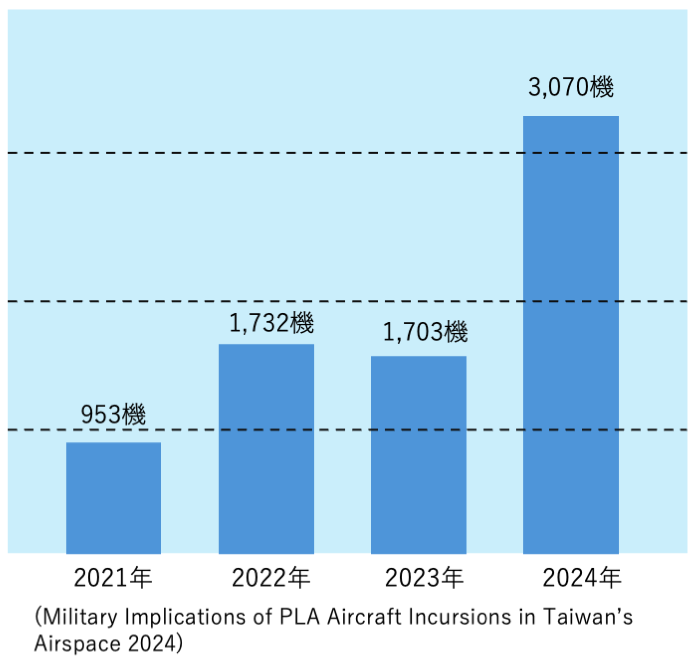 ジェームズタウン財団の分析(2025年1月)によれば、中間線を越えた中国軍機の延べ機数は年々増加しており、2024年には過去最高の3,070機を記録した。